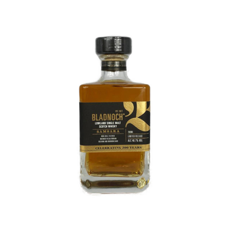 "Samsara", qui signifie "renaissance", symbolise la première libération et le réveil de la distillerie Bladnoch. Bladnoch Samsara est un succulent whisky écossais des Lowlands. Ce single malt est créé en assemblant des single malts Bladnoch vieillis en ex-fûts Bourbon et en ex fûts de vin rouge de Californie de premier remplissage, tous deux en chêne américain, afin de créer une bouche riche, vineuse et onctueuse. Il est produit à partir de l'eau pure de la rivière Bladnoch et d'orge locale. Le whisky Samsara est de couleur naturelle.
